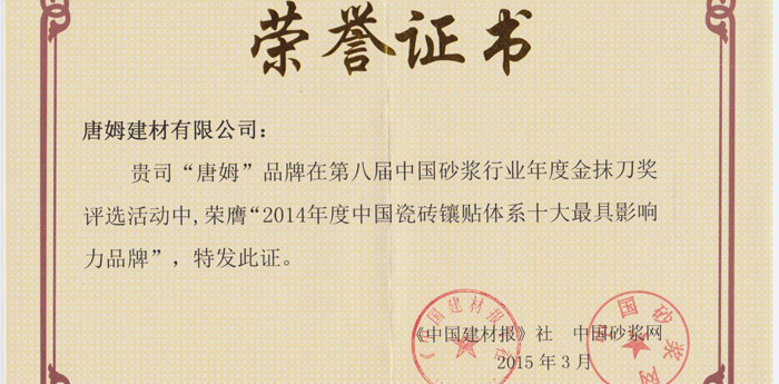 唐姆品牌先后參與制定了中華人民共和國(guó)陶瓷墻地磚膠粘劑行業(yè)標(biāo)準(zhǔn)JC/T547-2005和中華人民共和國(guó)陶瓷墻地磚填縫劑行業(yè)標(biāo)準(zhǔn)JC/T1004-2006,天然石材用水泥基膠粘劑JG/T355-2012,《建筑裝飾裝修工程質(zhì)量驗(yàn)收規(guī)范》GB50210,《外墻飾面磚工程施工及驗(yàn)收規(guī)程》JGJ126,《室內(nèi)建筑裝飾石材工程技術(shù)應(yīng)用規(guī)程》、《干混砂漿生產(chǎn)線(xiàn)設(shè)計(jì)規(guī)范》等、并于2006年9月推出了一款專(zhuān)門(mén)適用于中國(guó)�;u粘貼的“905玻化磚粘結(jié)劑”等相關(guān)產(chǎn)品。2014年10月,唐姆瓷磚粘結(jié)劑產(chǎn)品成功通過(guò)國(guó)家綠色建筑選用產(chǎn)品商標(biāo)認(rèn)證。